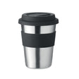 Gobelet en acier inoxydable simple paroi avec couvercle et poignée en silicone. Capacité de 350 ml. La simple paroi du gobelet peut entraîner un transfert de chaleur.