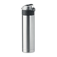 Garrafa de parede dupla em aço inoxidável de 400 ml com trava de segurança na tampa tendo que pressionar para abrir. Alça dobrável na parte superior para facilitar o transporte. Livre de vazamentos. Anti vazamento.